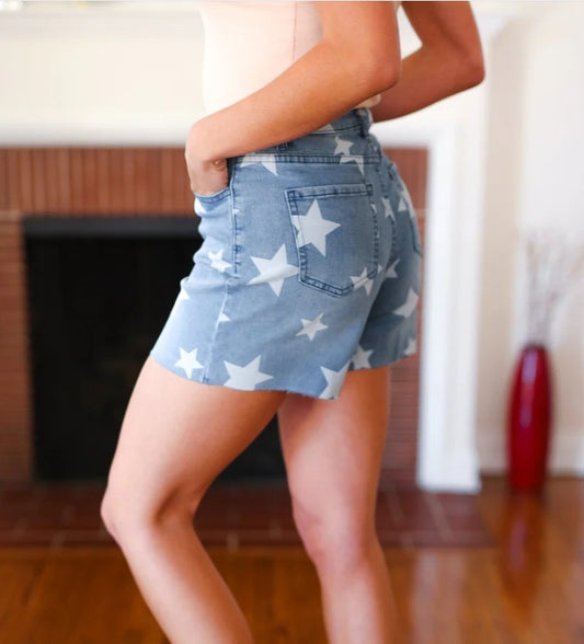 Plus Size Light Wash Star Print High Rise Denim Patriotic Shorts