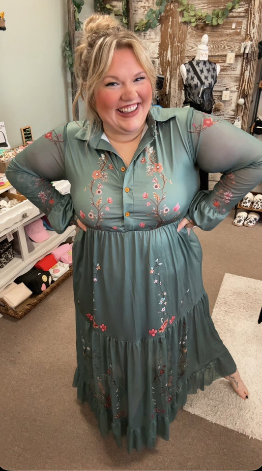 Blue Floral Collared Notch Neck Knit Dress W/Side Pockets(PREORDER)