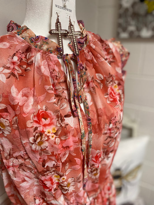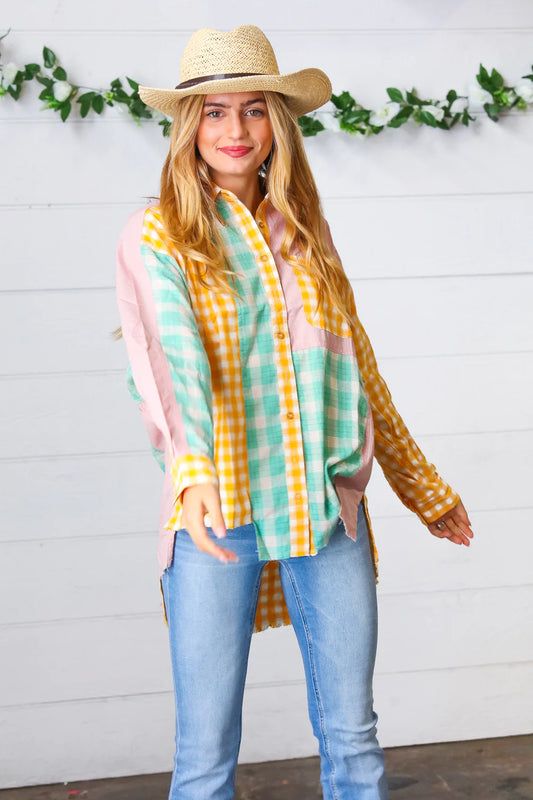 Mint Yellow Mauve Plaid Check & Stripe Patchwork Button Top