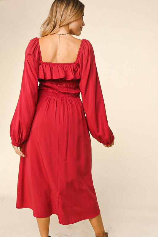 BURGUNDY SMOCKING FIT & FLARE WITH SIDE POCKETS DRESS