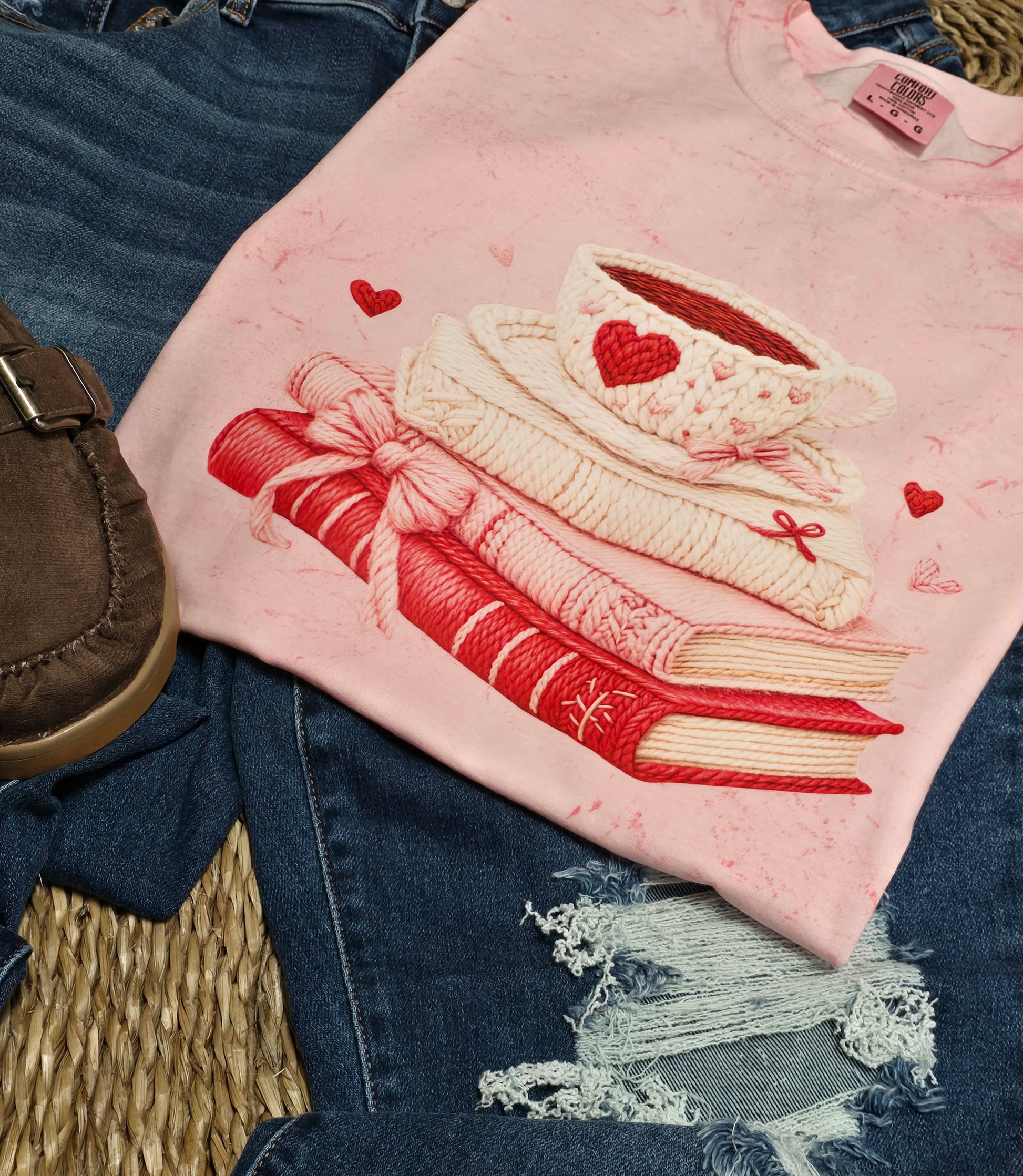 Our Pink Pages & Pour Overs Tee features a faux crocheted stacked book and coffee design with the prettiest pink, cozy-girl vibes. Printed on a Colorblast Comfort Colors tee using high-quality DTF for a soft feel and vibrant detail, this one is perfect for bookstore runs, coffee dates, and slow, comfy mornings.
