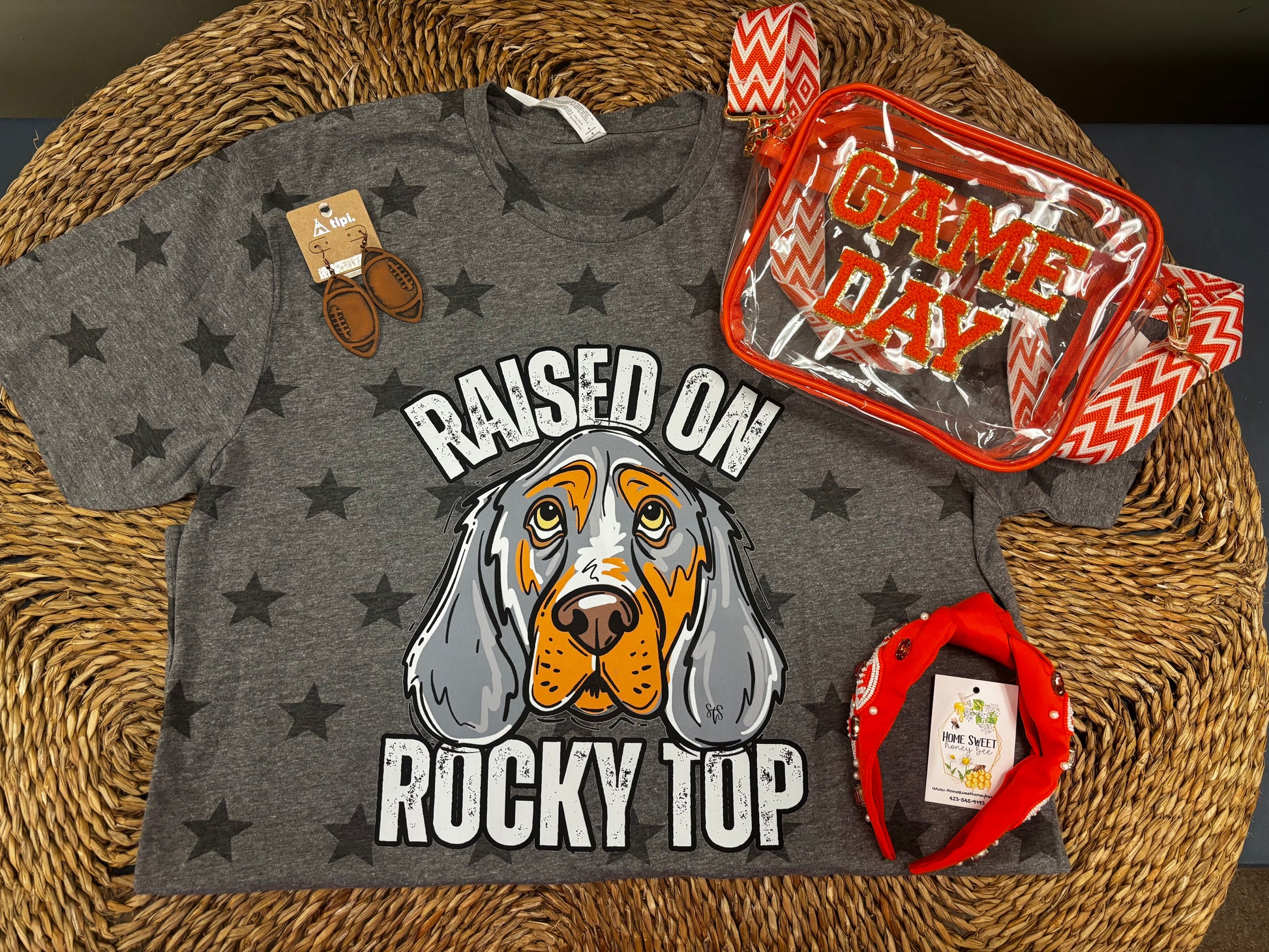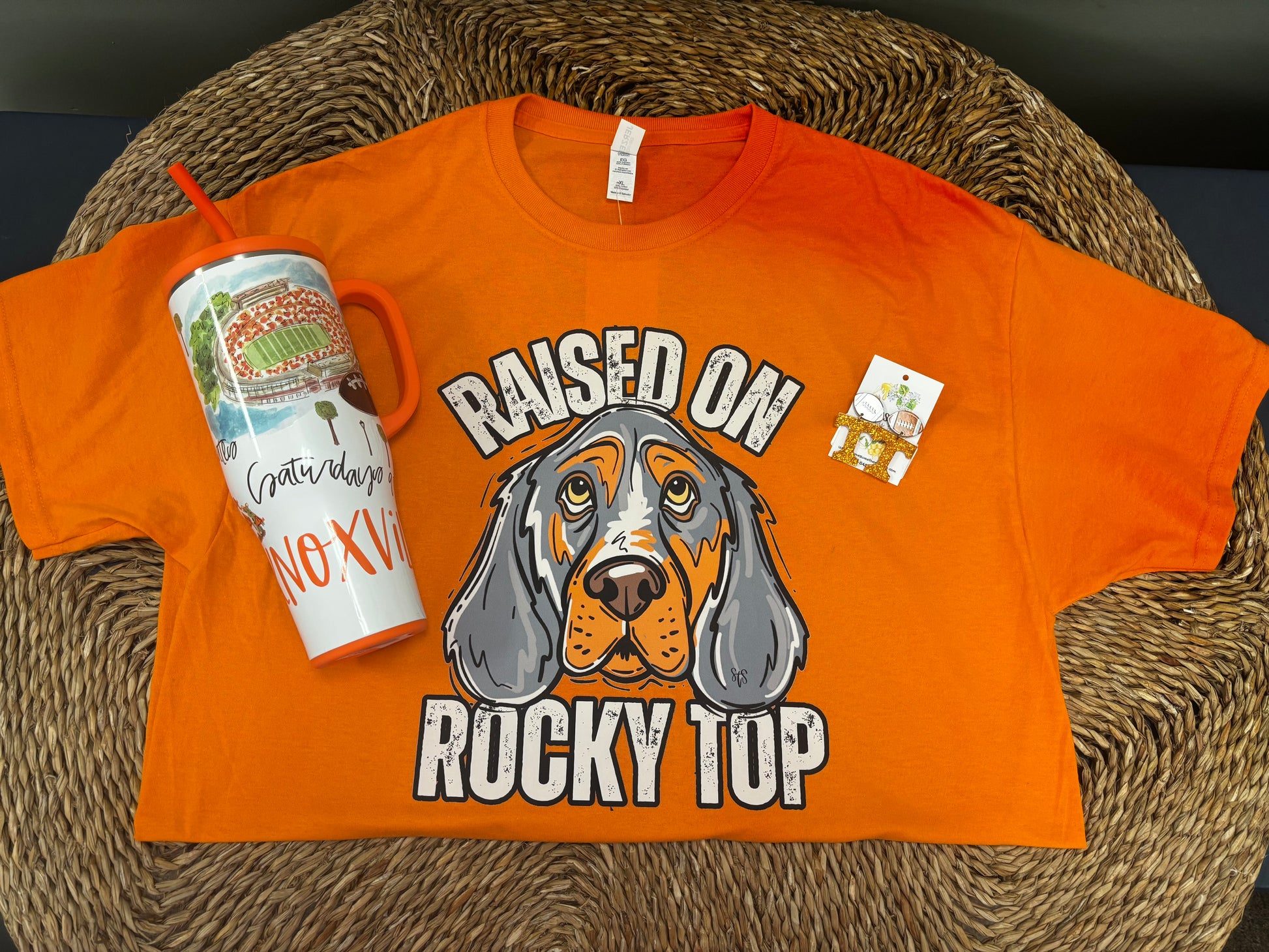 Celebrate your Tennessee roots with the Raised on Rocky Top Tee! This playful and comfy shirt is perfect for showing off your Volunteer pride with a fun, spirited twist. Whether you're cheering on the team or enjoying a casual day out, it adds a lively touch to your wardrobe.
