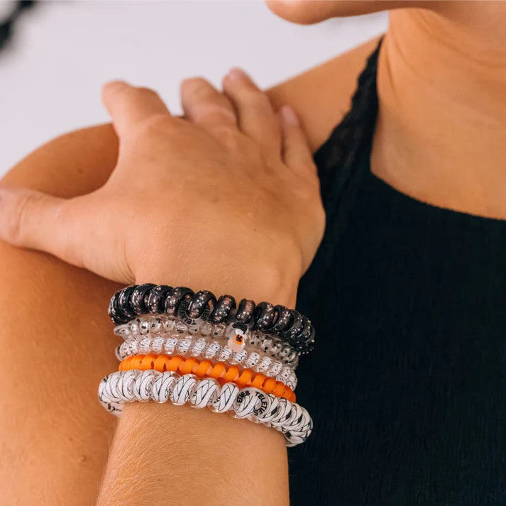 Hold your hair in place with ease and style! Mummy Knows Best Mix Pack Hair Ties in Black and Orange offer a strong grip without damage, doubling as a stylish bracelet when not in use. Your new favorite hair essentials all year round.