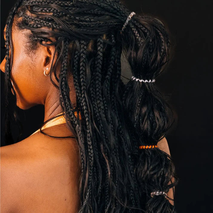 Spooky Sparkles Tiny Hair Ties in Black and Orange are the ultimate solution for securing braid ends, styling little kids' hair, or managing ultra-thin strands. These mini hair coils are designed to fit an adult finger like a ring rather than a bracelet, offering a strong, damage-free grip that keeps hair in place all day—without breakage, creases, or headaches.